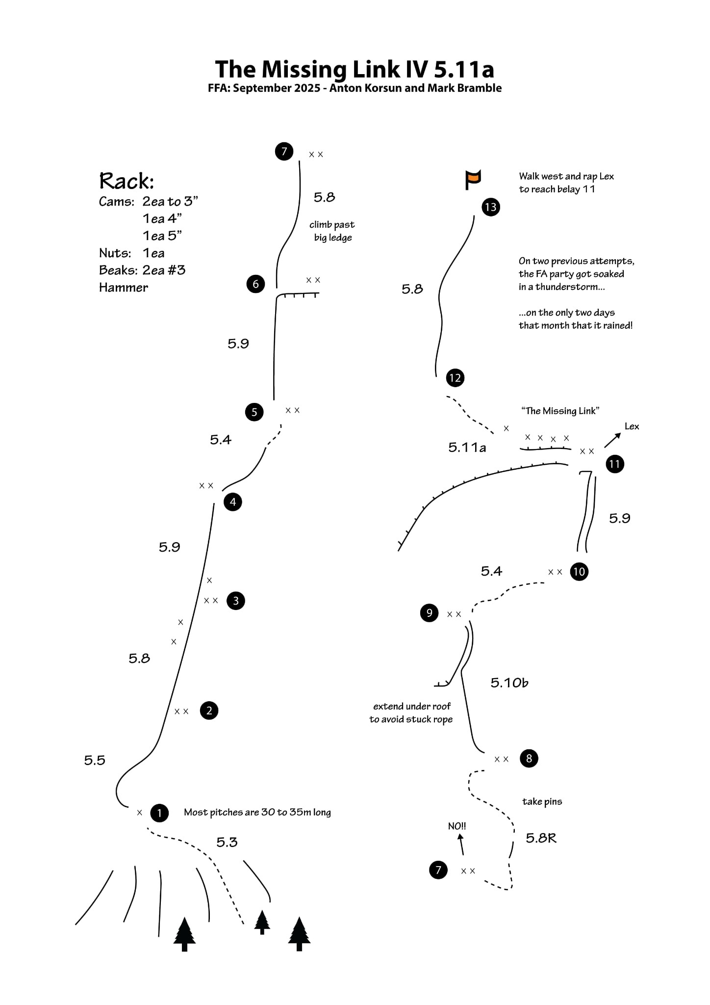 Route starts approx. 30m west of obvious gully system 100m east of Lex. There is a flat platform just by small tree at base of face. Anchors are bolted (p1 only 1 bolt P12 and 13 gear 2025) with some protection bolts. Set of nuts, double rack to #3 with a #4 and #5. A few pins and Beaks are recommended. Double 70m ropes allow better use of pro especially on p8 as well as easier raping with cleaner pulls.